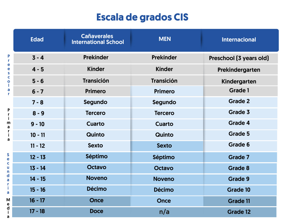 La siguiente tabla ofrece una referencia de la escala de las edades y grados de Cañaverales International School, frente a otros modelos internacionales. Es importante mencionar que la edad cronológica es una de las diferentes variables que se consideran para la asignación de los grados de los aspirantes a cupo.